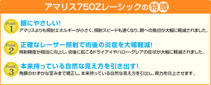 梅田院で取り扱う「アマリス750 Zレーシック」は、これまでのアマリスZレーシックよりも精度が向上し、照射時間も短縮された最新のレーシック機器です。