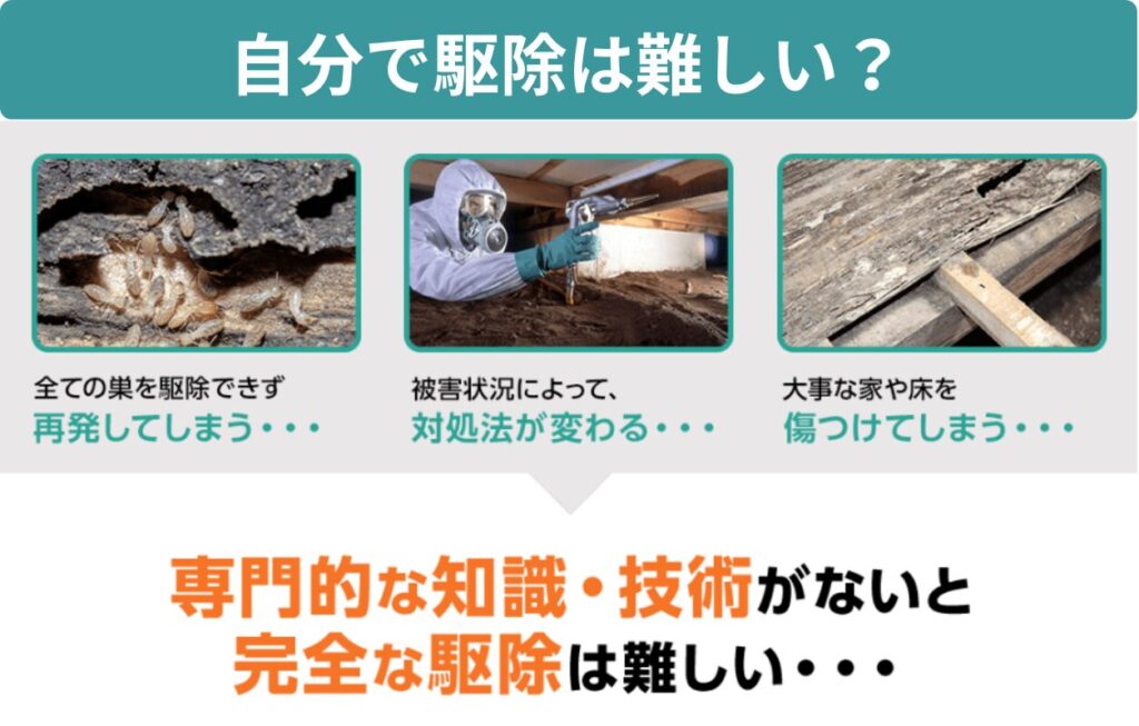 自分ですると全ての巣を駆除できず再発や被害拡大を招く恐れがあります。